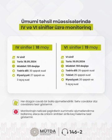 Mayın 18-də IV siniflər, mayın 19-da isə VI siniflər üzrə bütün dövlət ümumi təhsil müəssisələrinin şagirdləri üçün monitorinq keçiriləcək.