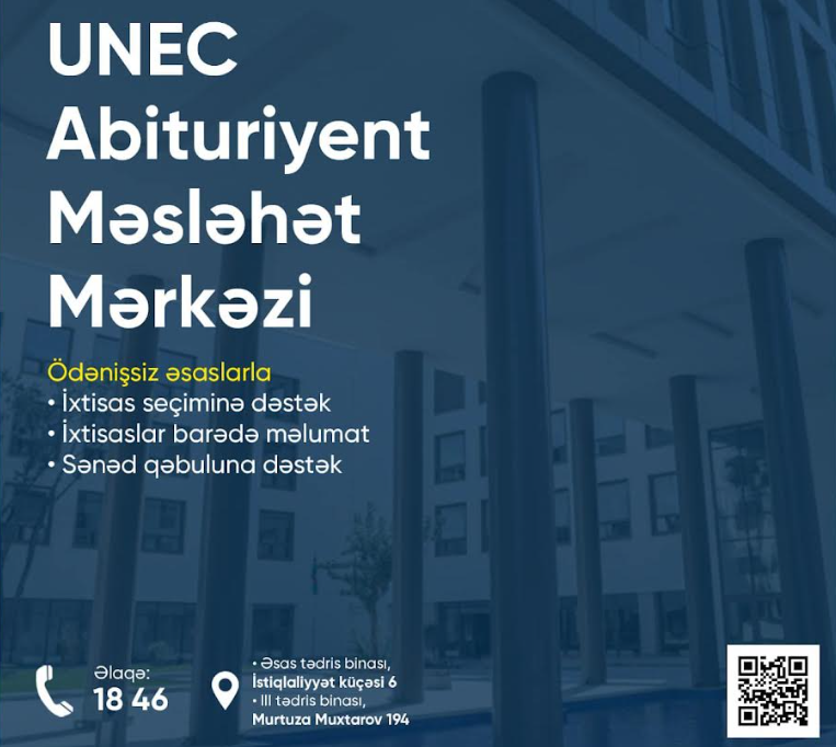 Abituriyent və valideynlər (012) 1846 (1-3) nömrəsinə zəng edərək, UNEC Abituriyent Məsləhət Mərkəzi ilə əlaqə saxlaya bilərlər.