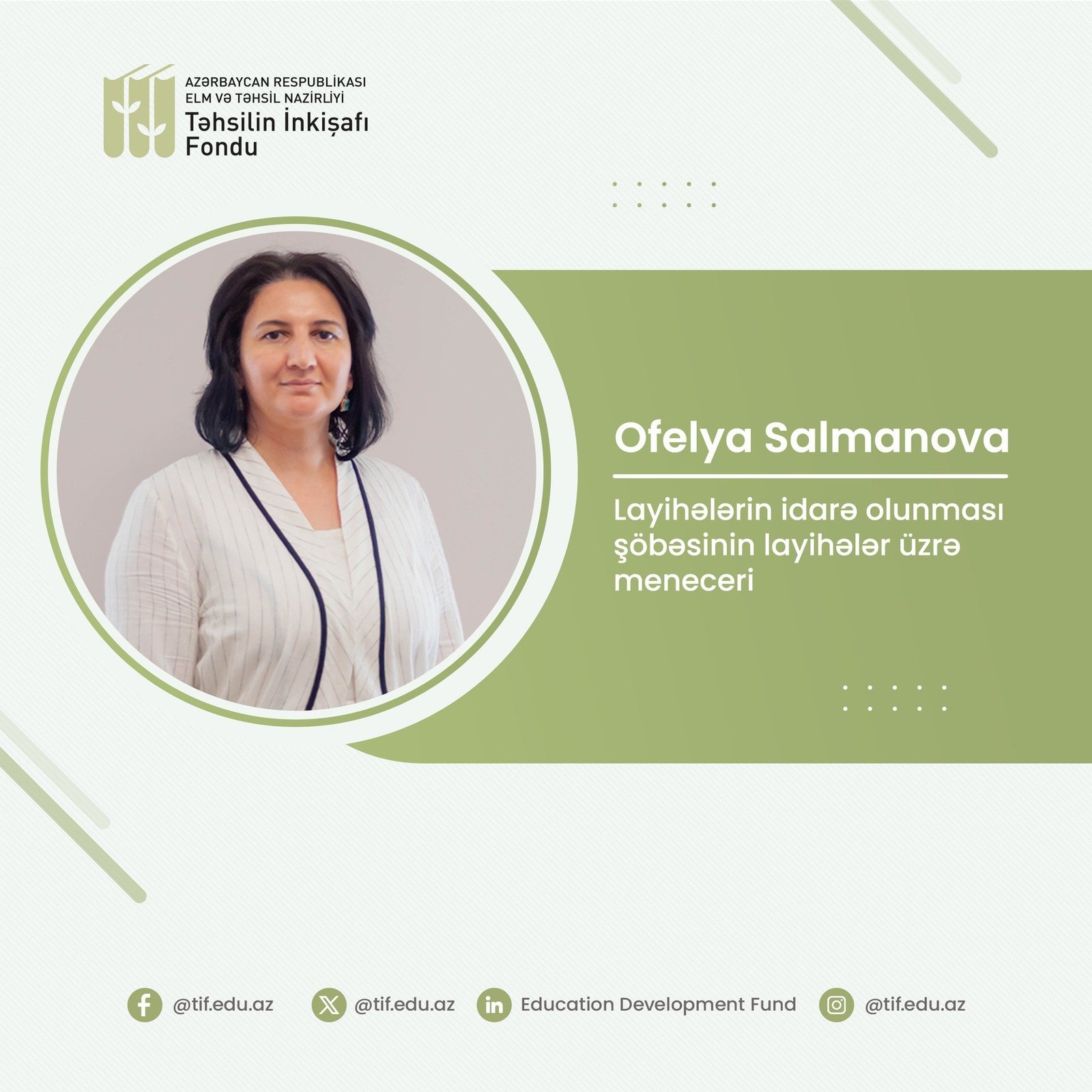 Modern.az-a istinadən xəbər veririk ki, o, Təhsilin İnkişafı Fondunun Layihələrin idarə olunması şöbəsinin layihələr üzrə meneceri vəzifəsinə təyin edilib.