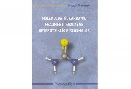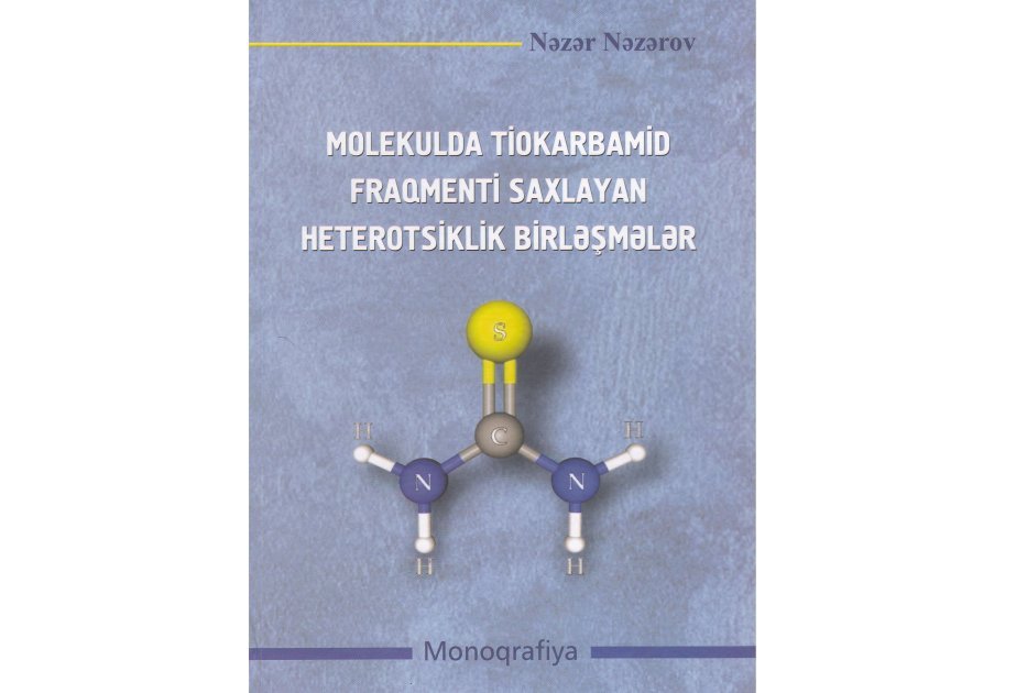 Azərbaycan Respublikası Elm və Təhsil Nazirliyinin akademik Əli Quliyev adına Aşqarlar Kimyası İnstitutunun aparıcı elmi işçisi kimya üzrə fəlsəfə doktoru Nəzər Nəzərovun “Molekulda tiokarbamid fraqmenti saxlayan heterotsiklik birləşmələr” adlı monoqrafiyası “Elm” nəşriyyatında nəfis tərtibatda işıq üzü görüb.