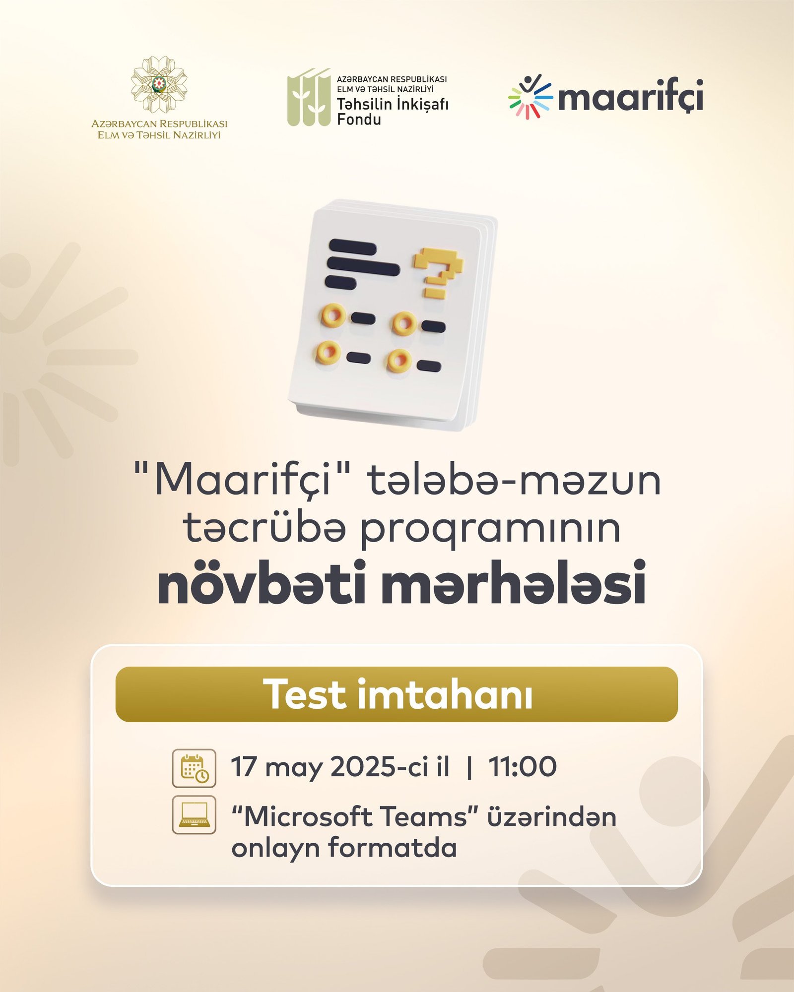 İmtahan 17 may saat 11:00-da “Microsoft Teams” platforması üzərindən onlayn formatda həyata keçiriləcək. Test imtahanında namizədlərə məntiq, dünyagörüşü, informasiya texnologiyaları, davranış səriştələrinin yoxlanılması üçün situasiya tipli mövzuları əhatə edən 60 sual təqdim olunacaq. İlkin mərhələdə seçdiyi sahəyə əsasən keçid balını toplayan namizədlər müsahibə mərhələsinə buraxılacaqlar.