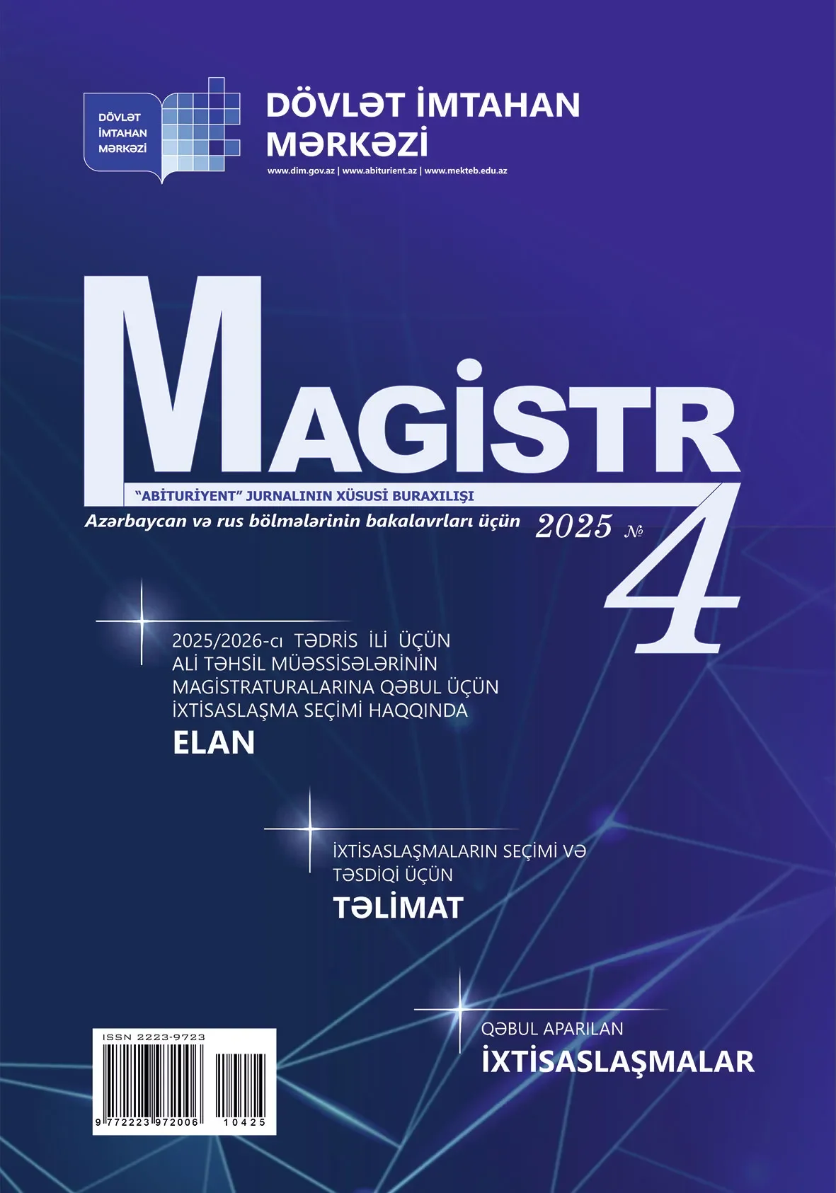 Jurnalın bu nömrəsində 2025/2026-cı tədris ili üçün Azərbaycan Respublikasının ali təhsil müəssisələrinin magistraturalarına qəbul üçün ixtisaslaşma seçimi haqqında elan dərc edilib.