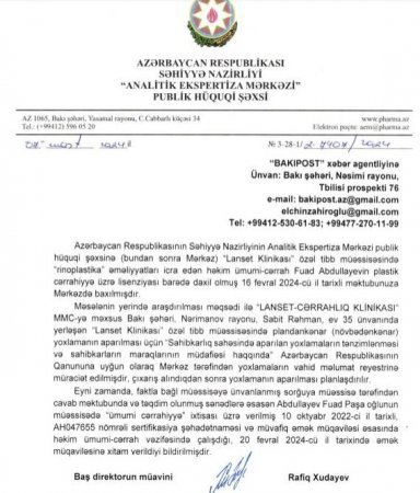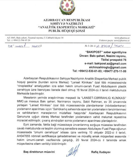 Bakupost.az məsələ ilə bağlı həm həkimin çalışdığı “Lanset Cərrahlıq klinikası”na, həm də Səhiyyə Nazirliyinin Analitik Ekspertiza Mərkəzinə sorğu göndərib.