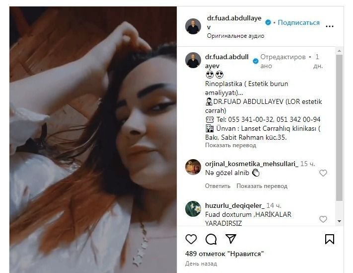 Məsələn, “Medicina”nın aşkara çıxardığı diplomu olmadan həm plastik-estetik, həm də LOR əməliyyatlar icra edən Fuad Abdullayevi. Məlum olub ki, bütün sosial şəbəkə profillərində plastik, estetik, LOR cərrah kimi özünü tanıdan Fuad Abdullayev əslində ixtisasca ümumi cərrahdır. O, 20 il ümumi cərrah kimi qarın boşluğu orqanları üzrə əməliyyatlar edib, Mərkəzi Dənizçilər Xəstəxanasında çalışıb.