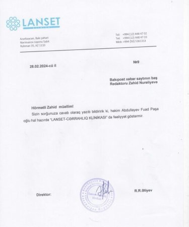 “Lanset Cərrahlıq klinikası”nın baş həkimi Rahim Əliyevin imzasıyla sorğuya cavab olaraq bildirilib ki, Fuad Abdullayevlə bağlanan müqaviləyə xitam verilib, hazırda həmin klinikada çalışmır.