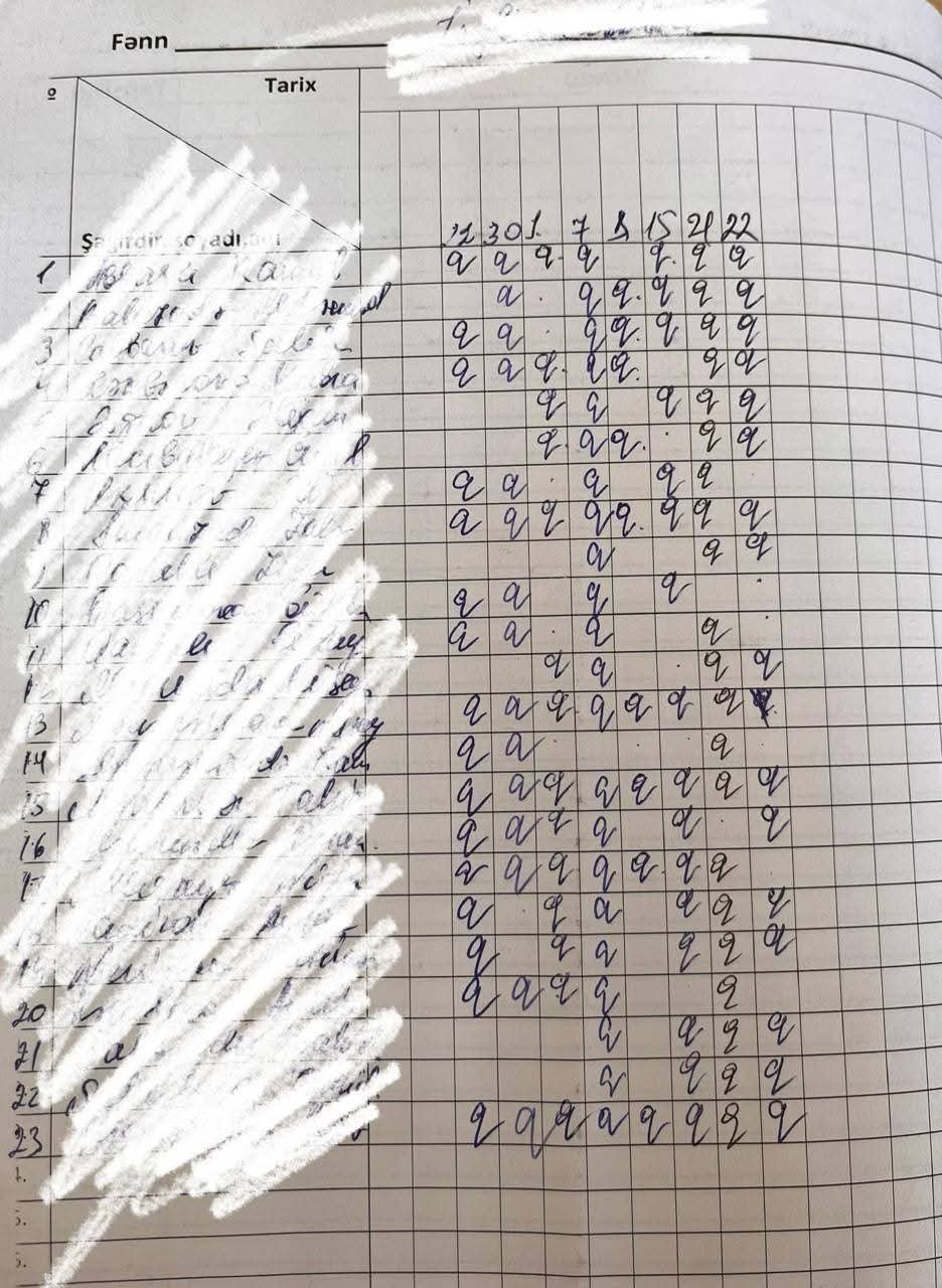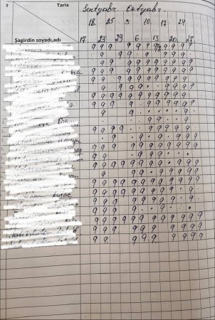 Gördüyünüz kimi məktəbdə davamiyyət olduqca zəifdir. Güman ki, yuxarı siniflərə aid bir jurnaldır. Hazırlığa gedən uşaqların dərsə gəlməməsi... Amma heç bir qaib gizlədilməyib, real olaraq yazılıb. Saxtakarlıq edilməyib, qanunsuzluq edilməyib. Yaxşı, burda həqiqətən direktorda günah varmı? Niyə?