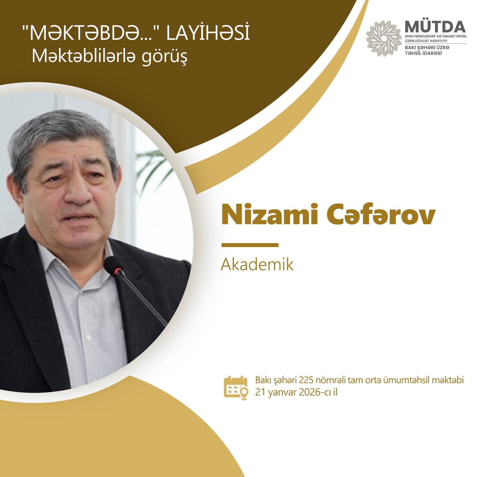 Bakı Şəhəri üzrə Təhsil İdarəsi tərəfindən reallaşdırılan “Məktəbdə...” layihəsinin növbəti görüşü yanvarın 21-də paytaxtdakı 225 nömrəli tam orta ümumtəhsil məktəbində keçiriləcək.