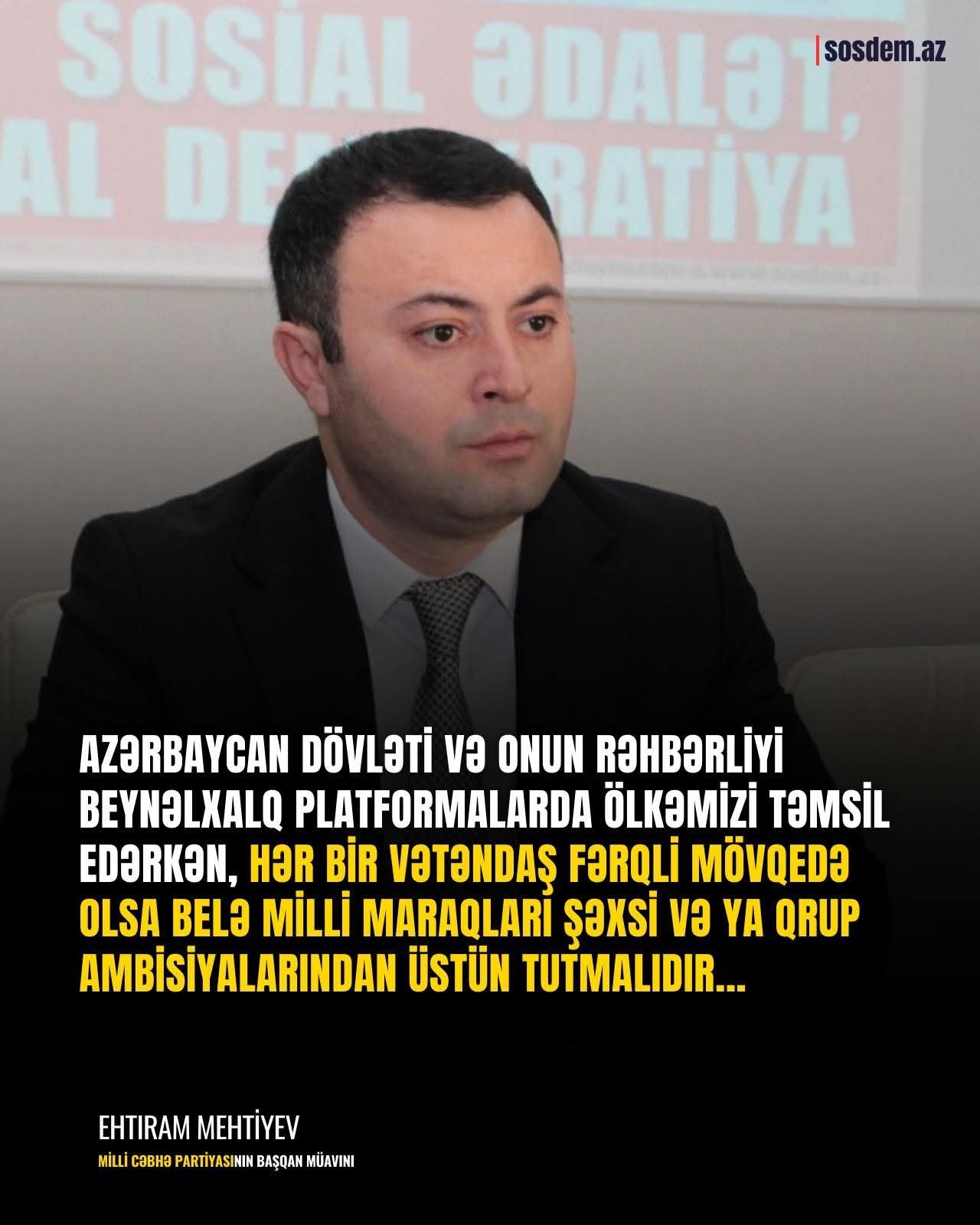 Hesab edirəm ki, dövlətçilik məsələsi siyasi baxışlardan üstündür. Azərbaycan dövləti və onun rəhbərliyi beynəlxalq platformalarda ölkəmizi təmsil edərkən, hər bir vətəndaş fərqli mövqedə olsa belə milli maraqları şəxsi və ya qrup ambisiyalarından üstün tutmalıdır. Bir siyasi partiya olaraq bu cür təxribatçı və radikal hərəkətləri qətiyyətlə pisləyirik. Siyasi mübarizə yalnız hüquqi çərçivədə, sivil və mədəni üsullarla aparılmalıdır. Dövlətimizin təhlükəsizliyinə və beynəlxalq nüfuzuna yönələn istənilən addım qəbuledilməzdir.