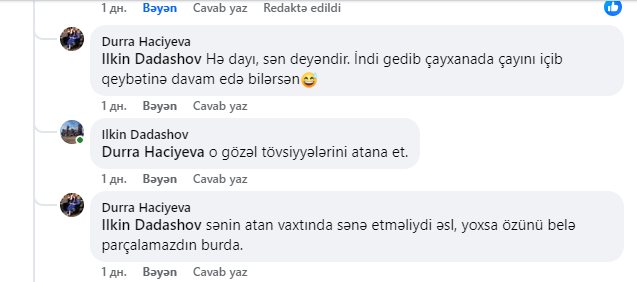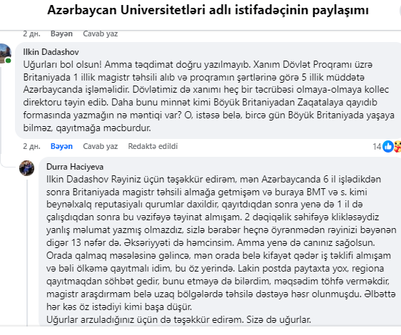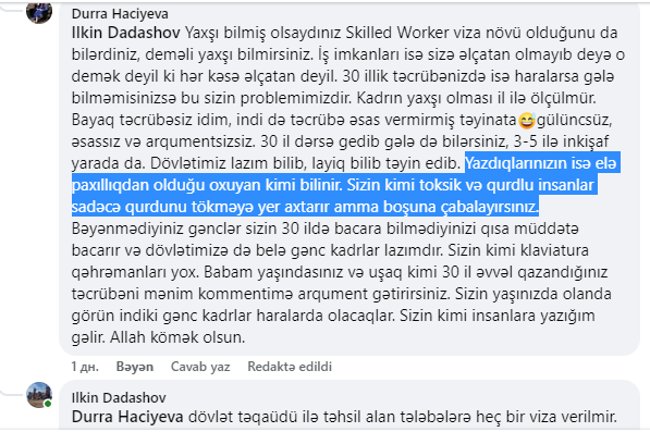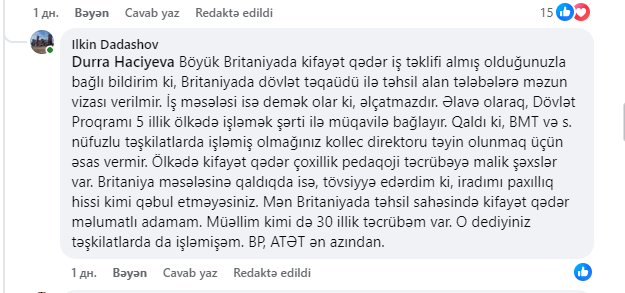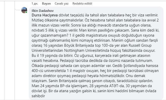 Bu sosial şəbəkələrdə müzakirələrə səbəb olub. Bəzi istifadəçilər öz fikirlərini yazıb, xarici təhsil, ölkəyə qayıdış, şəkil və qaydalarla bağlı qiymətləndirməni bölüşüblər.Lakin bu müzakirələrdən xoşu gəlməyən Zaqatala Dövlət İdarəetmə və Kollecinin direktoru Dürrə Hacıyeva rəylərə münasibət və normal müzakirə texnologiyası ilə bağlı yazan insanları açıq-aşkar müdafiə edib. "Sizin kimi toksik və qurdlu insanlar sadəcə qurdunuzu tökməyə yer axtarır, amma boşuna çabalayırsınız” və ya başqa yazılması mümkün olmayan sözlər...Maraqlıdır ki, Zaqatala Dövlət İdarəetmə və Texnologiya Kollecinin direktoru Dürrə Hacıyeva hansı psixoloji durumdadır?