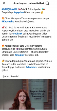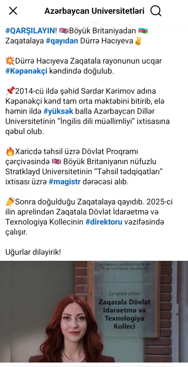 Bizimesr.az bildirir ki, paylaşımda qeyd olunur ki, Böyük Britaniyadan Zaqatalaya qayıdan Dürrə Hacıyeva Zaqatala rayonunun ucqar Kəpənəkçi kəndində doğulub. 2014-cü ildə şəhid Sərdar Kərimov adına Kəpənəkçi kənd tam orta məktəbi bitirib, elə həmin illərdə balla Azərbaycan Dillər Universitetinin “İngilis dili müəllimliyi” ixtisasına qəbul olub.Xaricdə Təhsil üzrə Dövlət Proqramı Böyük Britaniyanın Stratklayd Universitetinin “Təhsil tədqiqatları” ixtisası üzrə magistr dərəcəsi. Sonra doğulduğu Zaqatala qayıdıb. 2025-ci ilin aprelindən Zaqatala İdarəetmə və Texnologiya Kollecinin direktoru vəzifəsində çalışır.