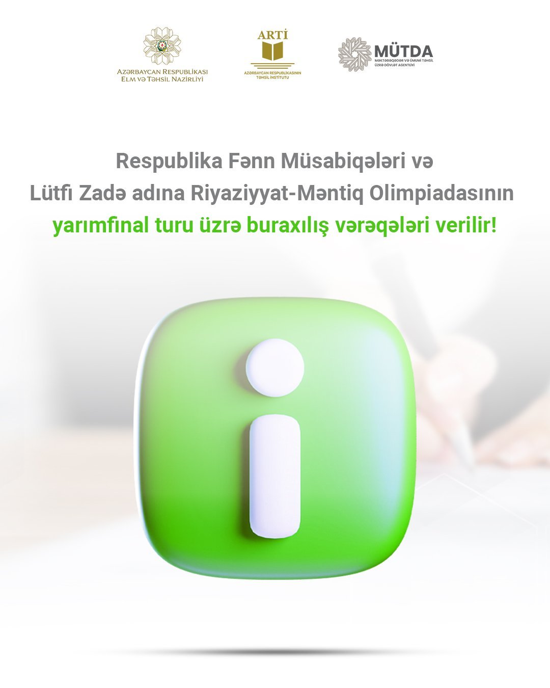 Aprelin 27-dən etibarən Respublika Fənn Müsabiqələrinin və Lütfi Zadə adına Riyaziyyat-Məntiq Olimpiadasının yarımfinal mərhələsinin buraxılış vərəqələrinin verilməsinə başlanılıb.