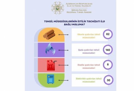 tehsil.media xəbər verir ki, Regional idarənin tabeliyində fəaliyyət göstərən 213 müəssisədən 201 müəssisə qazla, 11 müəssisə odunla, 1 müəssisə dizellə qızdırılır.