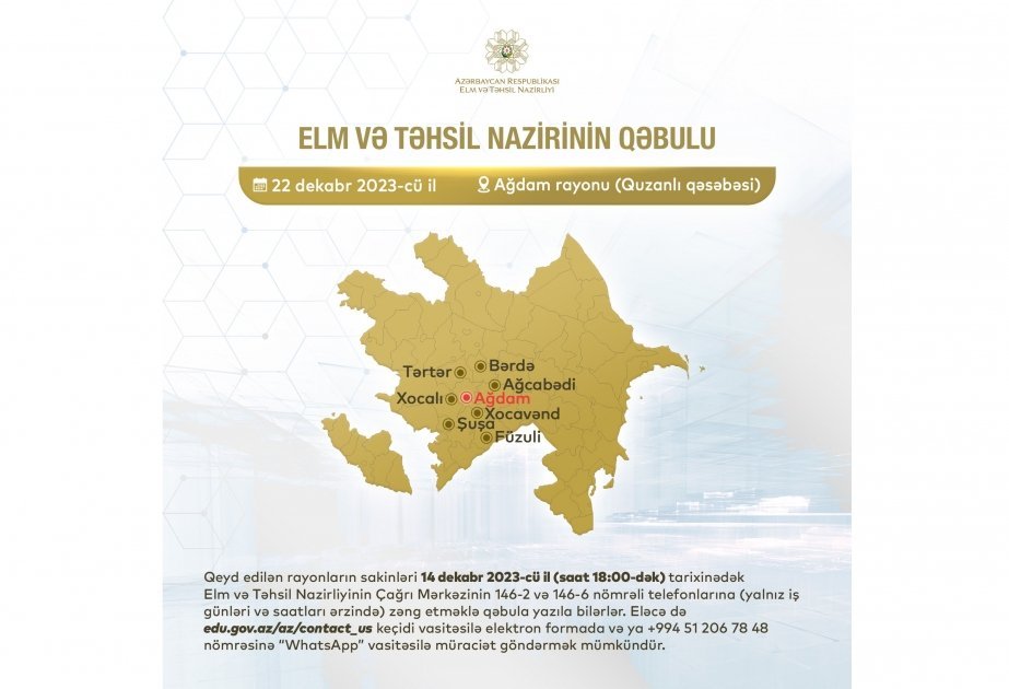 Elm və təhsil naziri Emin Əmrullayev dekabrın 22-də Ağdam rayonunun Quzanlı qəsəbəsində vətəndaşlarla görüşəcək.