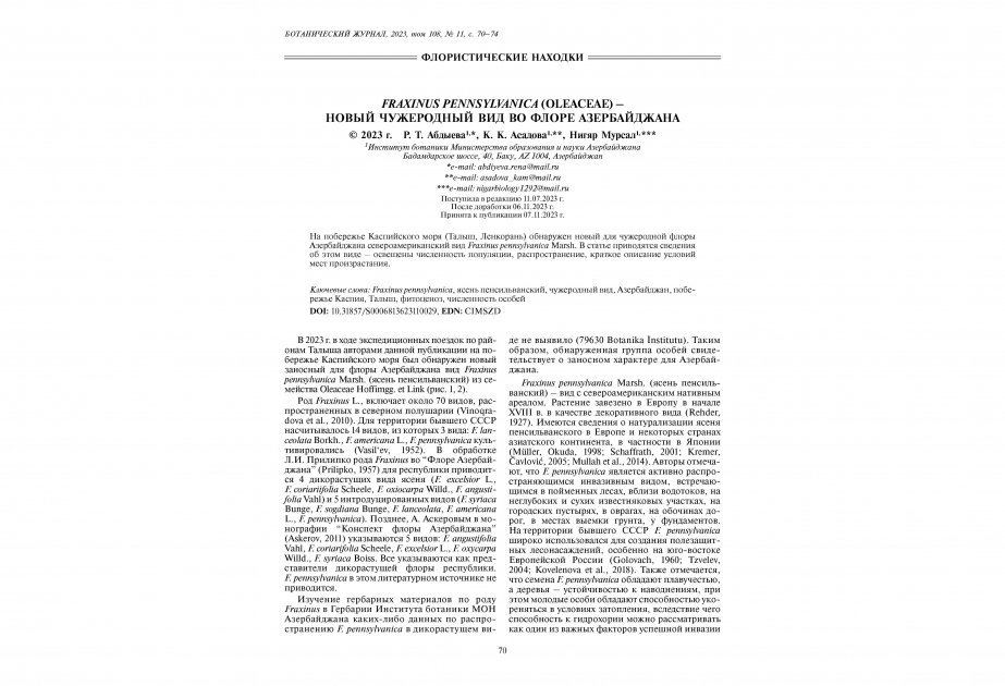 Bildirilib ki, məqalə Azərbaycanın invaziv florası üçün yeni olan Fraxinus pennsylvanica Marsh., (Pensilvan göyrüşü (Oleaceae fəsiləsi) Şimali Amerika ağac növünün aşkar edilməsindən bəhs edir. Botanik alimlər 2023-cü ildə respublikanın cənub rayonlarına ekspedisiya zamanı Lənkəran rayonunun dənizkənarı sahələrində sözügedən növün fərdlərini qeydə alıblar. Məqalədə qeyd olunur ki, Pensilvan göyrüşünün aşkar edilən yabanı 8 fərdi vegetativ və cavan generativ ontogenetik vəziyyətdədir. Növün az sayda olması onun dənizkənarı ərazilərə yenicə daxil olduğunu göstərir və invaziv statusuna görə “introduksiyadan qaçmış” növ kimi qiymətləndirilir. Bu növ taxta-şalban istehsalı üçün iqtisadi əhəmiyyət daşıyır. Növün bioekoloji xüsusiyyətlərinə və yayılmasının dinamikasına gələcək tədqiqatlarda diqqət yetiriləcəkdir.