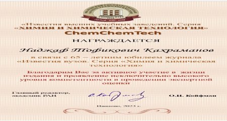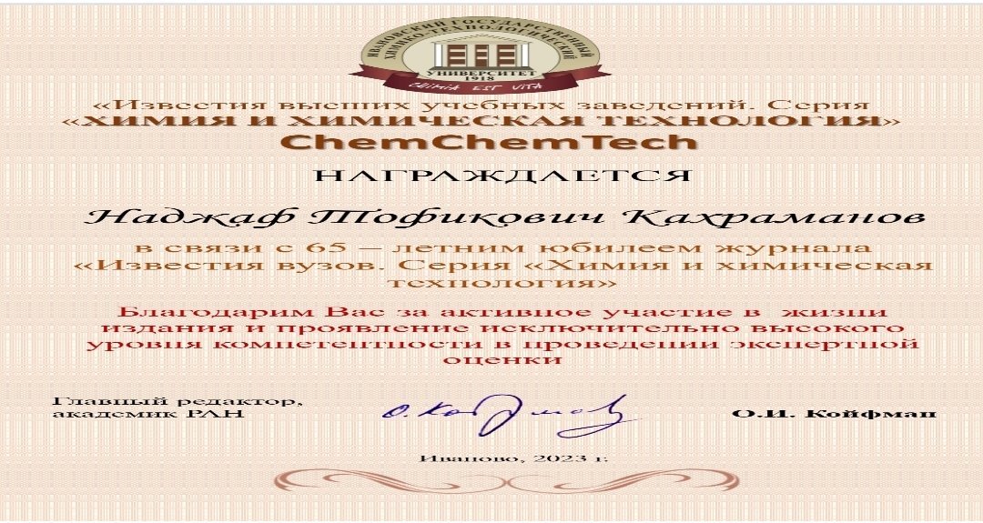 Elm və Təhsil Nazirliyinin Polimer Materialları İnstitutunun Polimerlərin mexaniki-kimyəvi modifikasiyası və emalı laboratoriyasının müdiri kimya elmləri doktoru, professor Nəcəf Tofiq oğlu Qəhrəmanov “Известия высших учебных заведений” jurnalının “Химия и химическая технология” (ChemChemTech) seriyasının 65 illik yubileyi münasibəti ilə nəşr sahəsində fəal iştirakına və ekspert qiymətləndirmələrinin aparılmasında olduqca yüksək səviyyəli səriştə nümayiş etdirdiyinə görə jurnalın baş redaktoru Rusiya Elmlər Akademiyasının akademiki Oskar İosifoviç Kоyfman tərəfindən təşəkkürnamə ilə mükafatlandırılıb.